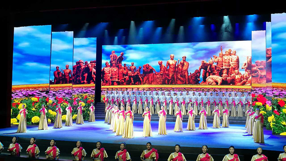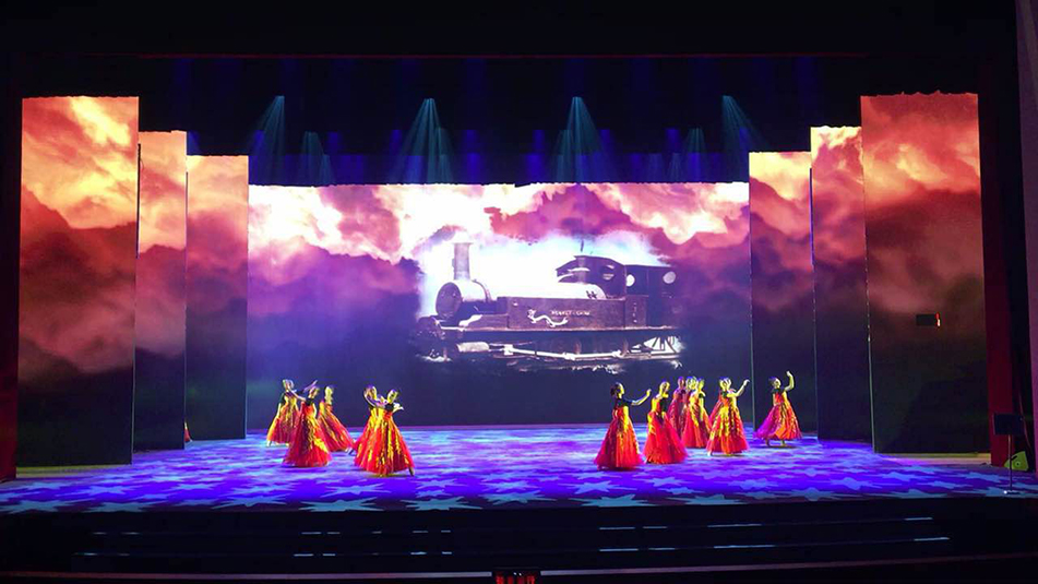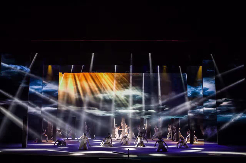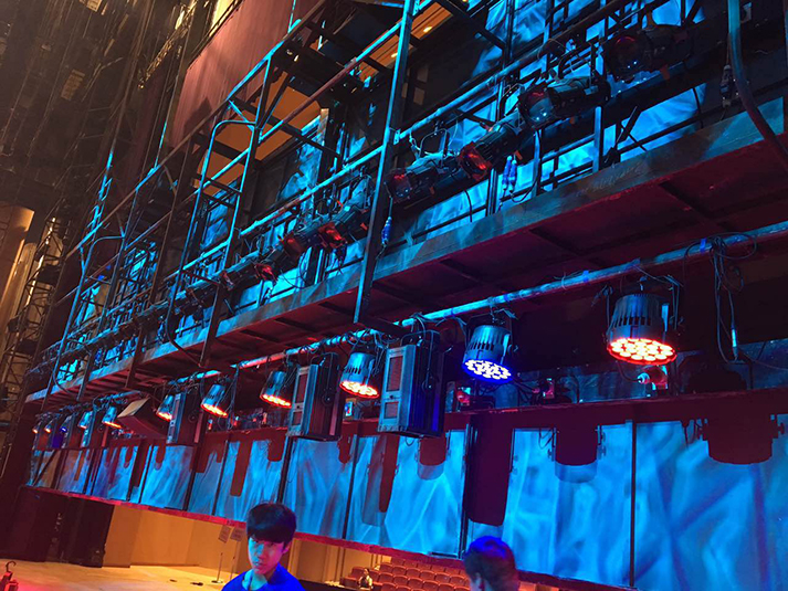 "我從舞臺(tái)劇的燈光設(shè)計(jì)思路出發(fā),用沿幕把所有燈具在舞臺(tái)上隱藏起來,使觀眾看不見燈具只看見色彩和光線。這次晚會(huì)共采用了80臺(tái)1500w圖案燈(特寶麗V2500S)、60臺(tái)1500w染色燈、120臺(tái)光束燈(特寶麗PT320B)、160臺(tái)LED燈、40臺(tái)切割燈(特寶麗V3000P)以及4臺(tái)追光燈(特寶麗FS300M)。切割燈特寶麗V3000P主要做面光使用,用于把舞臺(tái)多余的光切掉,使舞臺(tái)更干凈更透亮,同時(shí)也讓演員和舞美道具等清晰可見。“小鋼炮”浩洋光束燈PT320B主要用于打造炫目的舞臺(tái)效果;我在設(shè)計(jì)中將圖案燈里面的圖案與染色燈的色彩功能充分疊加之后鋪照在舞臺(tái)上,這種方式能夠呈現(xiàn)出更加繽紛和絢麗的圖案效果;地流燈和側(cè)光的運(yùn)用則讓每一位演員都在舞臺(tái)上呈現(xiàn)更加立體。