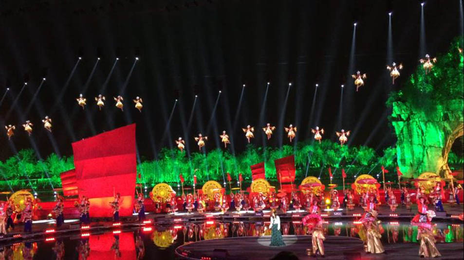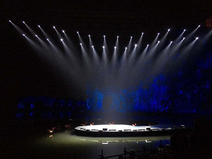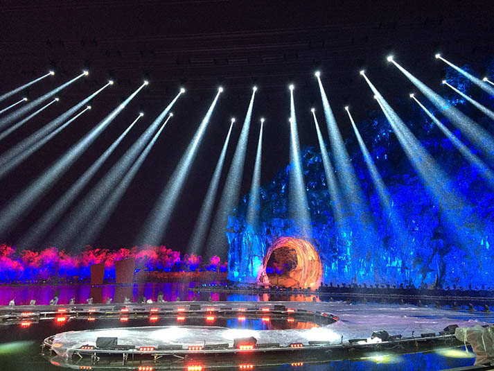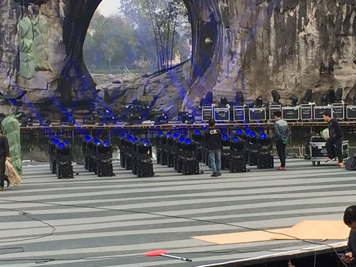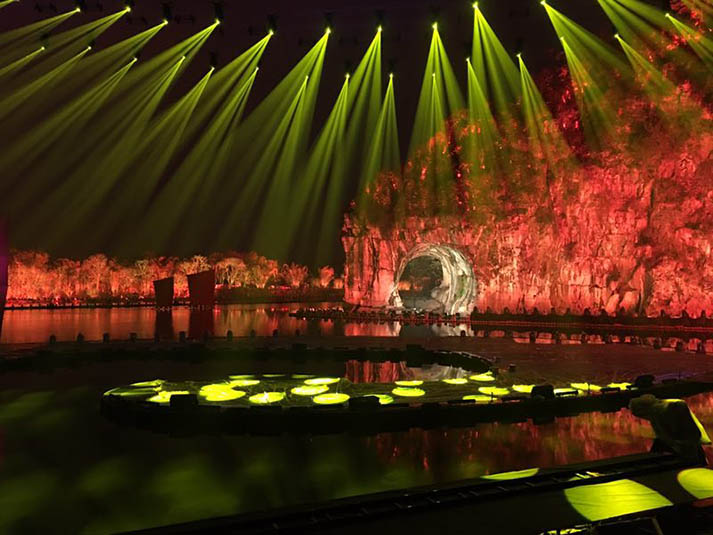 浩洋電子采用內(nèi)置Philip全球首發(fā)鉑金21R光源的全新三合一電腦燈G21HYBRID,結(jié)合浩洋創(chuàng)新研發(fā)全新移動(dòng)電源挑戰(zhàn)此次高難度的舞臺(tái)燈光設(shè)計(jì),突破在水上搭建舞臺(tái)的重重困難,讓燈具首次高掛在半空,成功實(shí)現(xiàn)世界首創(chuàng)驚艷電腦燈飛行演出!為桂林分會(huì)場(chǎng)的舞臺(tái)燈光設(shè)計(jì)增添一大閃耀的關(guān)注點(diǎn)。而身處岸邊的染色燈City400擔(dān)任裝點(diǎn)象鼻山的重責(zé),將水中心的象鼻山裝點(diǎn)成一片綠意盎然的畫面。