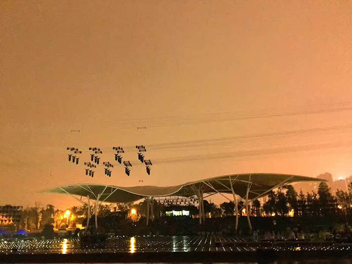 總導演李彥介紹,全劇不僅通過音、舞、詩、樂、頌等多種藝術載體,還原了瀏陽河最美的人、景、民俗和史實,更有多處創(chuàng)新:視覺方面,首次將瀏陽焰火融入實景演出;燈光特效方面,更是大膽采用了今年央視春晚全球首次使用的“天外飛燈”。繼2017央視春晚桂林分會場的“天外飛燈”表演秀驚艷全球后,浩洋電子“天外飛燈-FOS360”系統(tǒng)強勢助陣大型田園花火情境實景演出《瀏陽河上》,再次實現(xiàn)專業(yè)舞臺電腦燈飛行演出,打造飛行燈光舞臺。浩洋電子通過極富創(chuàng)意的燈光設計和表現(xiàn)力十足的燈光應用,生動演繹了瀏陽河的精神風貌。