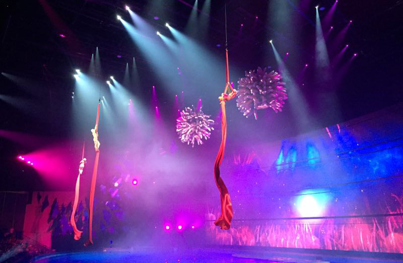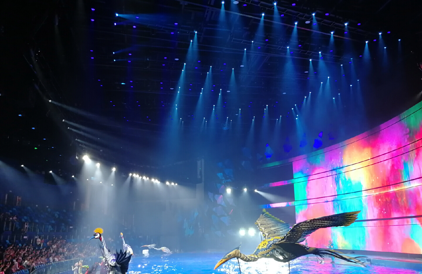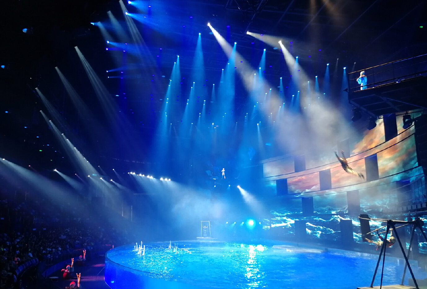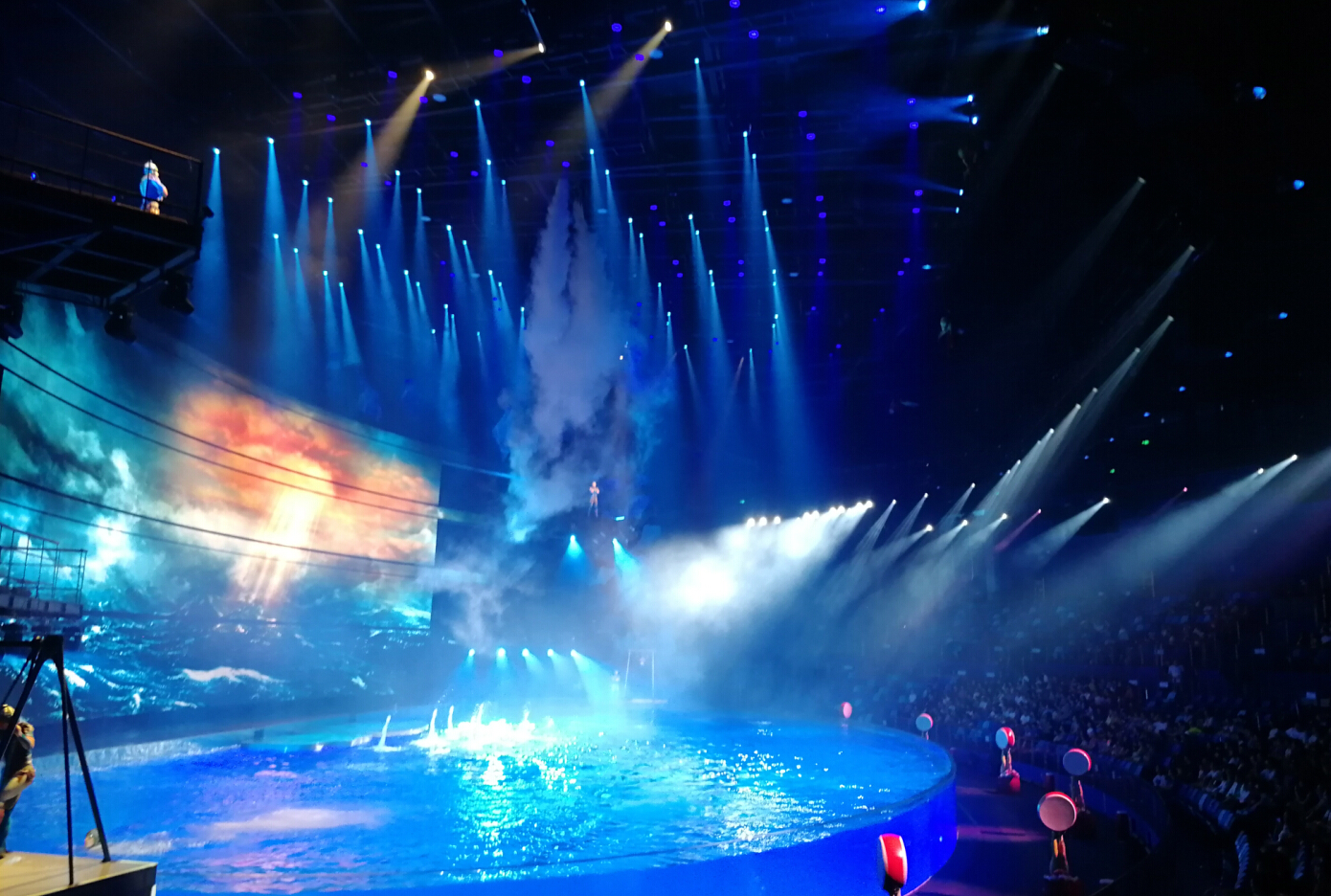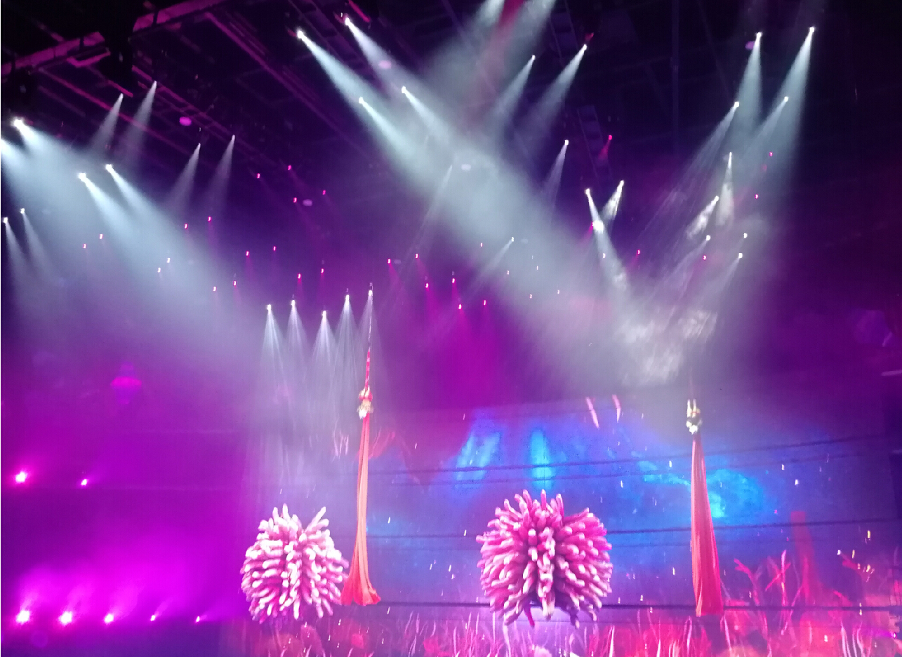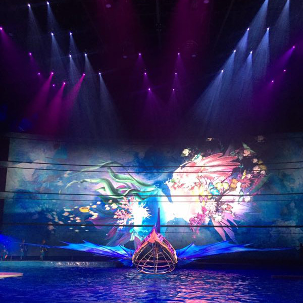 演出中,浩洋電子全能王三合一電腦燈G12HYBRID、切割燈V3000P、圖案燈V2500S、LED PAR燈A51-E近400臺(tái)專業(yè)舞臺(tái)燈光設(shè)備為現(xiàn)場(chǎng)助陣。浩洋燈光設(shè)備投射出炫目的燈光,與現(xiàn)場(chǎng)的煙霧、水面特效、無人機(jī)、各種大型自動(dòng)化舞美機(jī)械在內(nèi)的國際頂尖舞臺(tái)技術(shù)相互配合,融合水中芭蕾、空中藝術(shù)、花式跳水等眾多表演元素,共同呈現(xiàn)原創(chuàng)鉅制,還原了傳說中神秘古老的“亞特蘭蒂斯”世界。