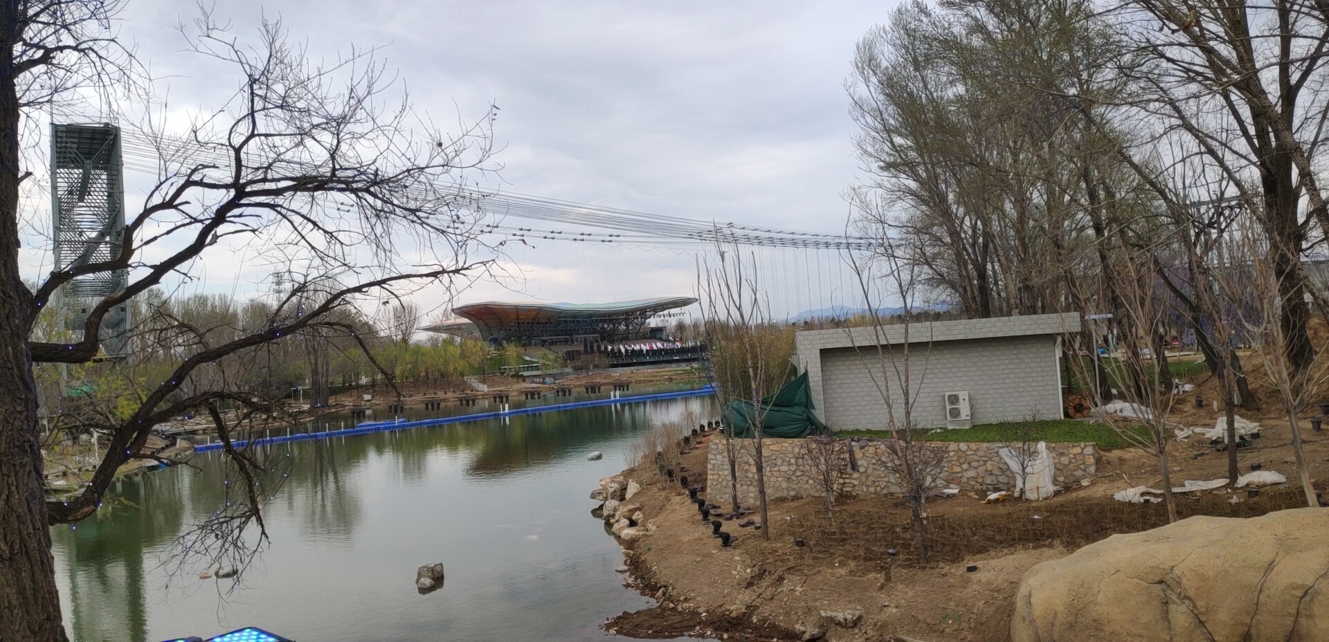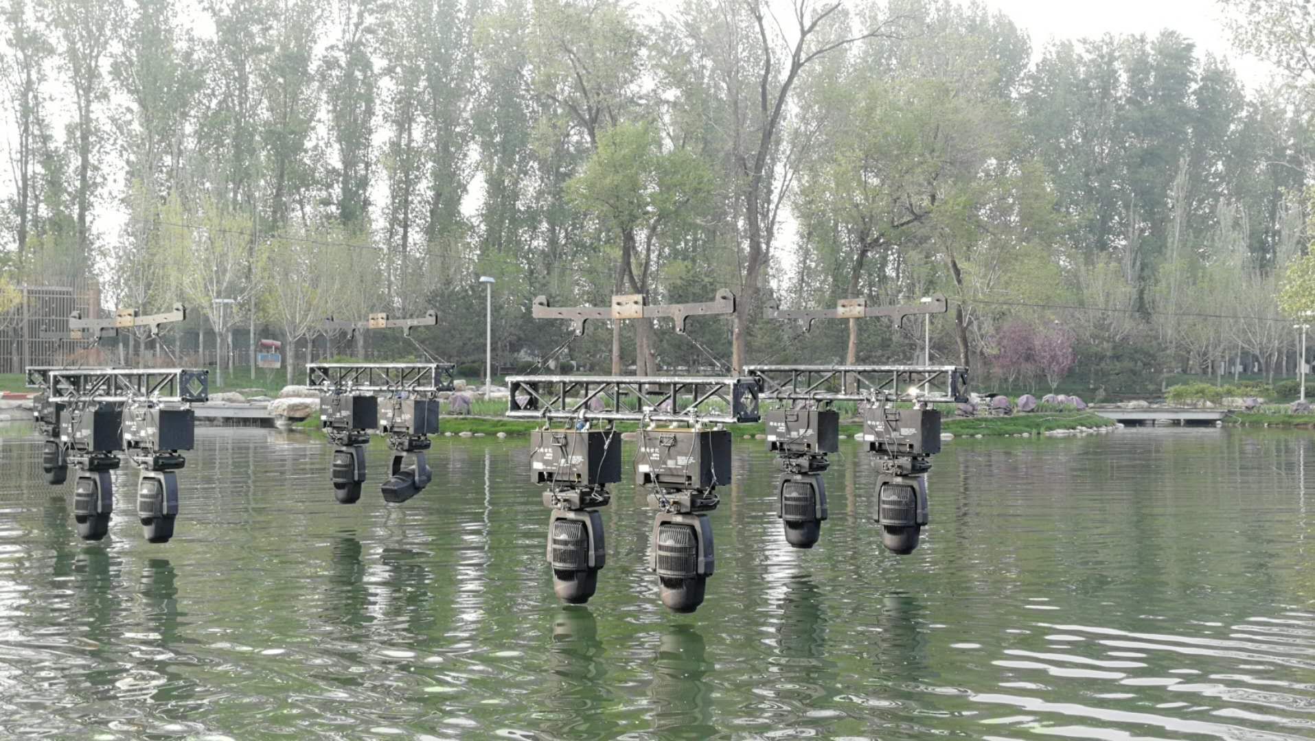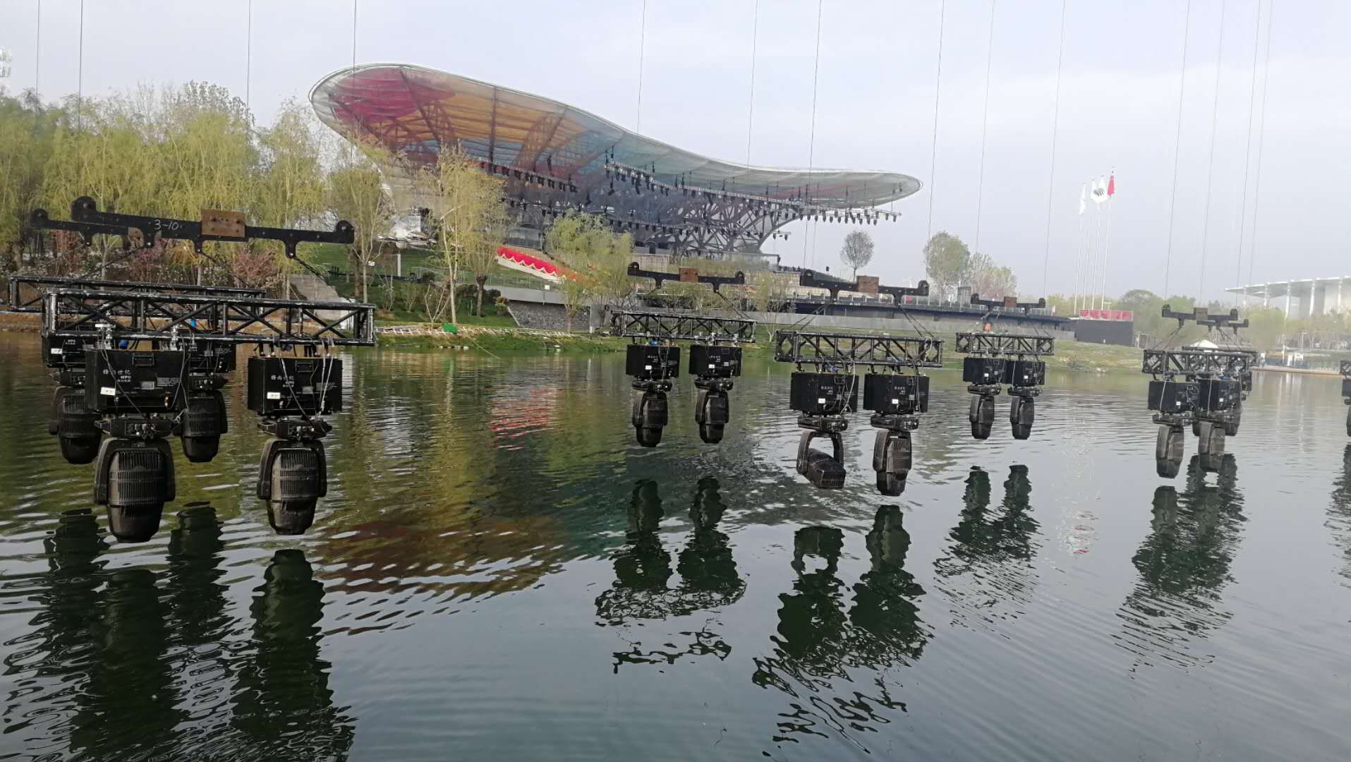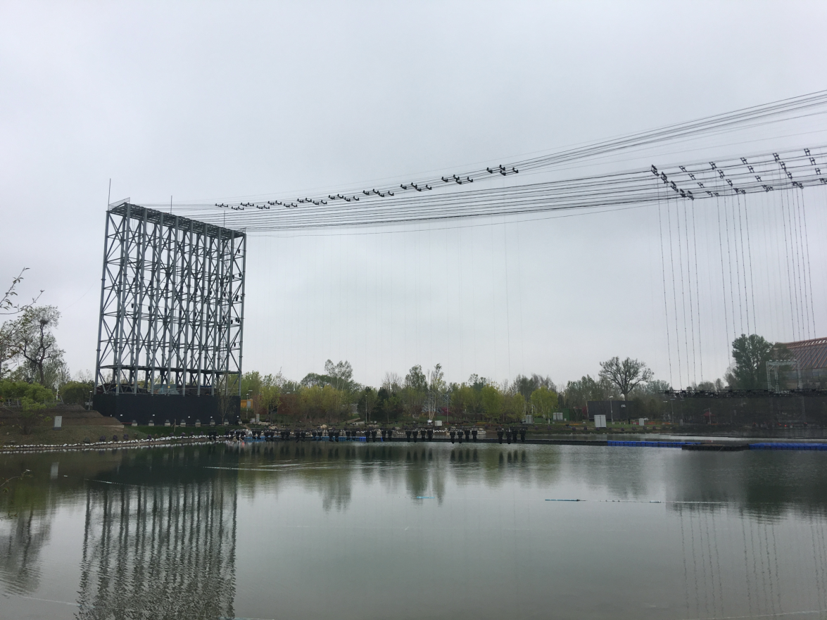 為了承載背景網(wǎng)屏和燈光設(shè)備,開幕式專門臨時(shí)搭建了兩座鋼結(jié)構(gòu)威亞塔架,塔高39米,塔間跨度280米。塔間共搭設(shè)重型威亞索道16套,吊點(diǎn)總數(shù)218個(gè)。使用威亞控制系統(tǒng)將藝術(shù)空間擴(kuò)展升華,空中矩陣隱形LED屏幕、空中矩陣數(shù)控飛燈等與地面舞臺(tái)表演完美結(jié)合,給觀眾帶來超強(qiáng)的視覺震撼效果。