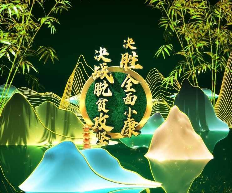 該篇章以綠色為主色調(diào),青山流水為景,畫(huà)面由畫(huà)筆描繪錦鯉,翠竹傍山,盡顯中國(guó)一片綠水青山的大好景致。以此畫(huà)面帶出2020年我國(guó)將全面建成小康社會(huì),實(shí)現(xiàn)第一個(gè)百年奮斗目標(biāo)的堅(jiān)定決心。