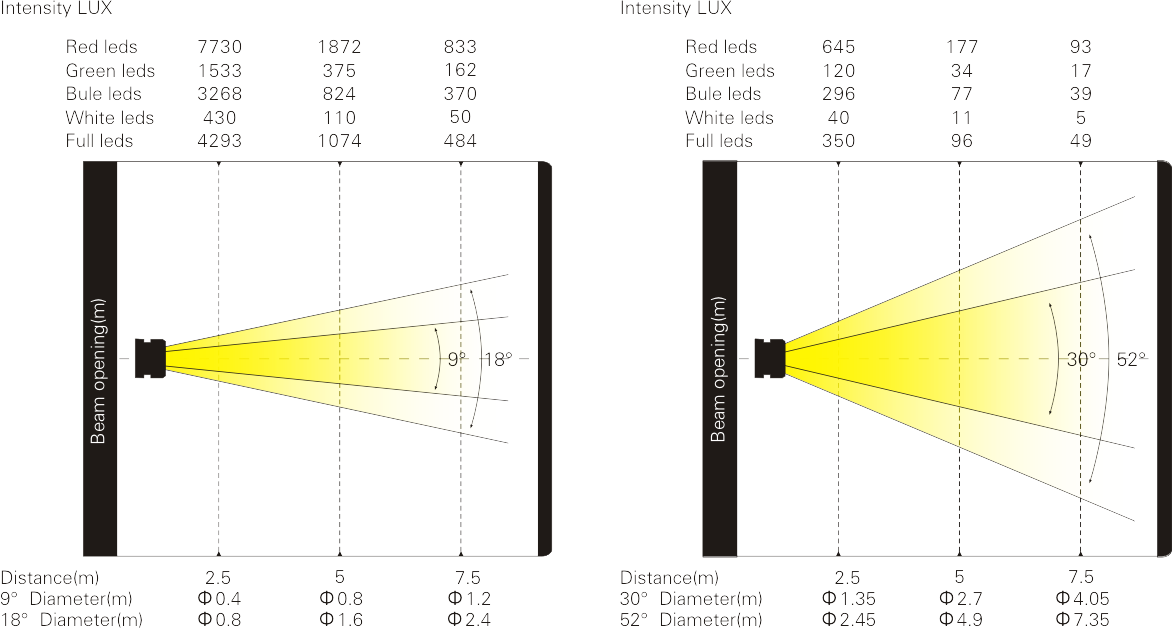 LED類型:7顆15W大功率RGBW 4合1 LED, 達(dá)到均勻細(xì)膩的混色效果