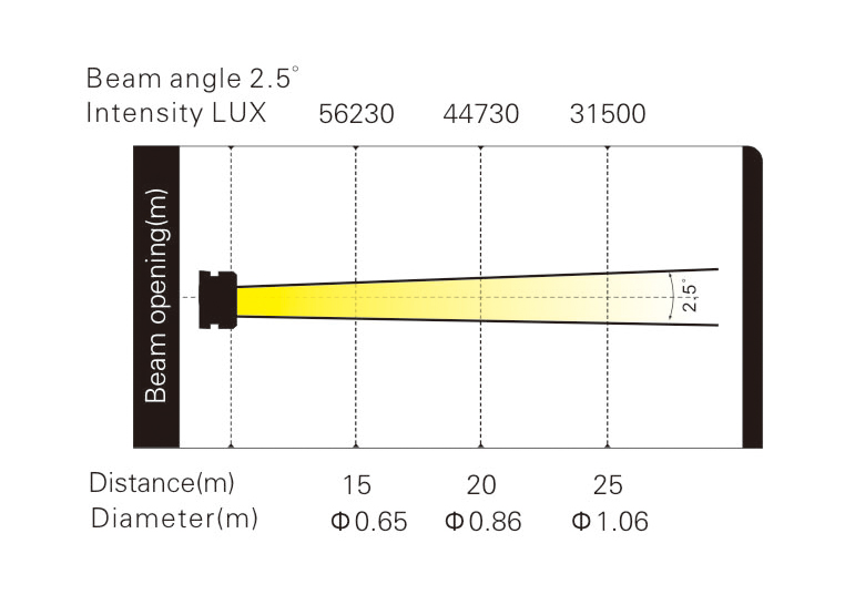 光斑角度:2.5°,獨特的光路結(jié)構(gòu)使光束效果更強更亮