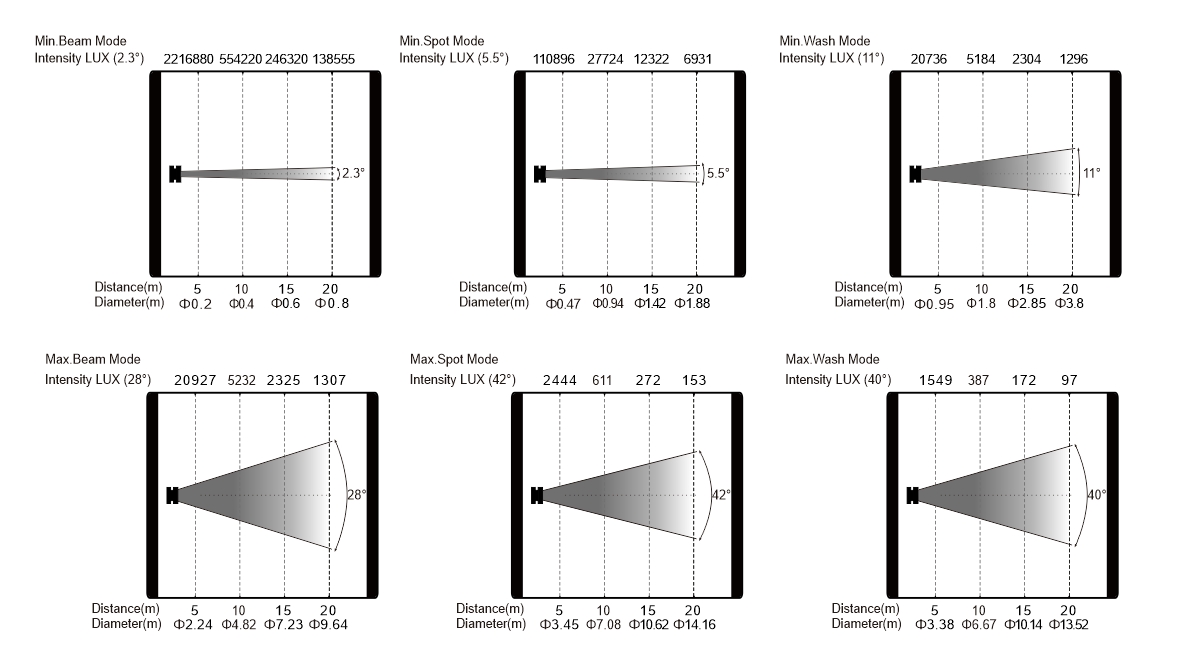 變焦范圍:光束模式:2.3°-28°;圖案模式:5.5°-42°;染色模式:11°-40°
