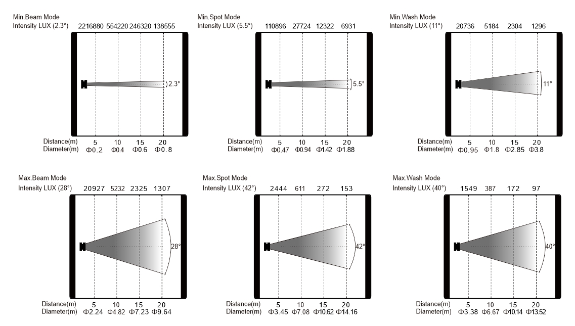 變焦范圍:光束模式:2.3°-28°;圖案模式:5.5°-42°;染色模式:11°-40°